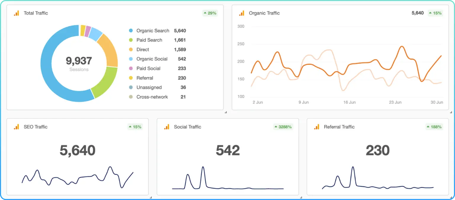 The analytics dashboard highlights this growth across channels, with organic traffic steadily climbing and total sessions rising as shown below: